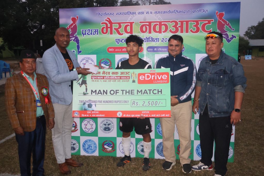 भैरहवा, २१ मंसिर । रुपन्देहीको सिद्धार्थनगर नगरपालिका–१ स्थित पक्लिहवा माध्यमिक विद्यालयको खेलमैदानमा शनिबारदेखि ‘प्रथम भैरव नकआउट फुटबल प्रतियोगिता–२०८२’ सुरु भएको छ । श्री भैरव युवा क्लब नयाँ गाउँ, रानी गाउँको आयोजना तथा सिद्धार्थनगर नगरपालिका १ नम्बर वडा कार्यालयको मुख्य प्रायोजनमा भएको प्रतियोगिता मंसिर २७ गतेसम्म सञ्चालन हुन भएको छ ।